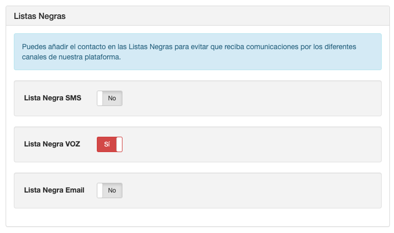 Una Baja por Voz puede definirse como el proceso en el cual se añaden contactos a la Lista Negra de VOZ para que no reciban más llamadas desde tu cuenta. Este proceso lo pueden realizar los destinatarios de tus llamadas si incluyes en tus campañas un código de respuesta para añadir a la Lista Negra, o de forma manual, escogiendo que contactos quieres que no reciban más llamadas desde tu cuenta.