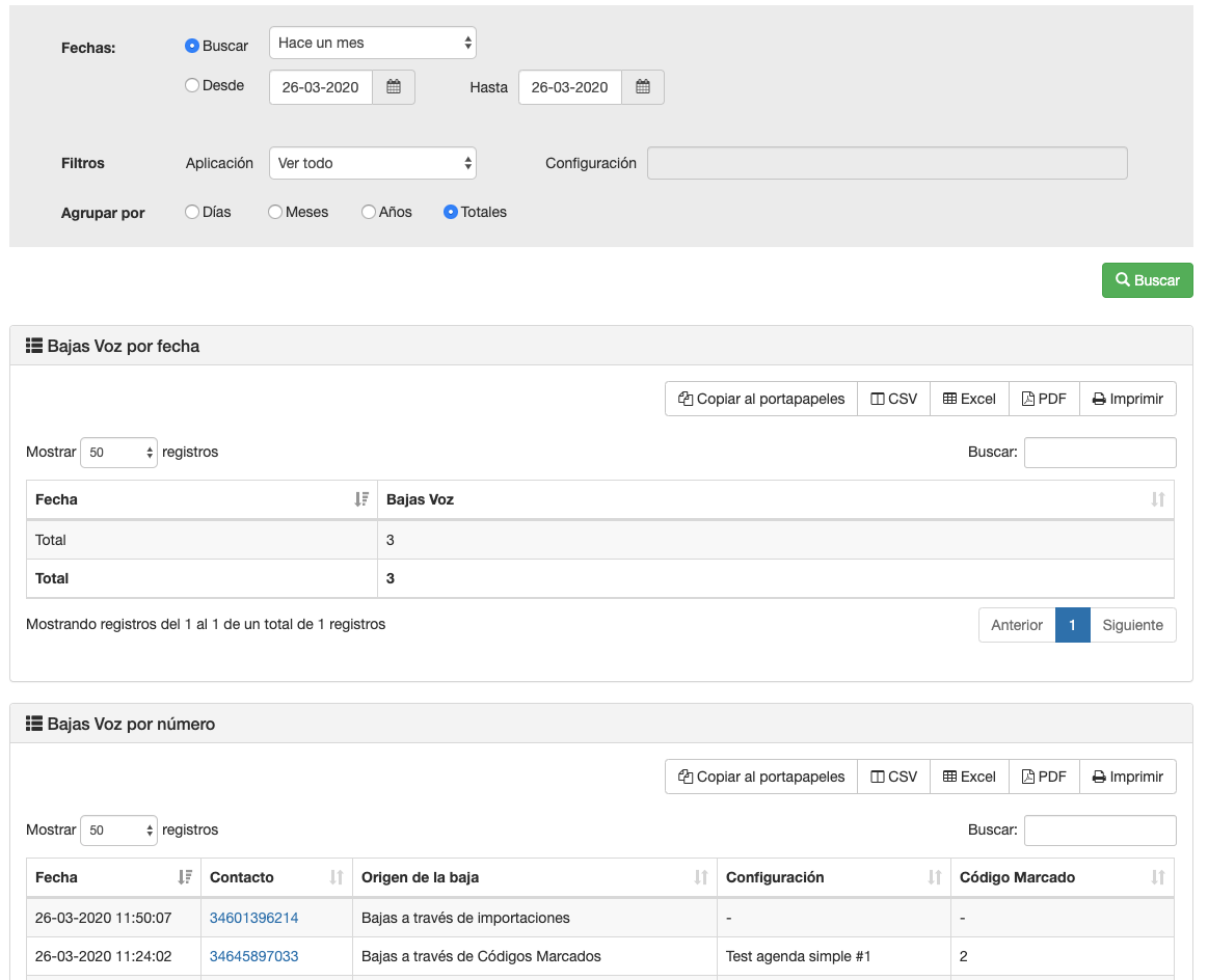 Y también podrás exportar los datos de las Bajas de Voz para que puedas analizarlos externamente y optimizar tus envíos.