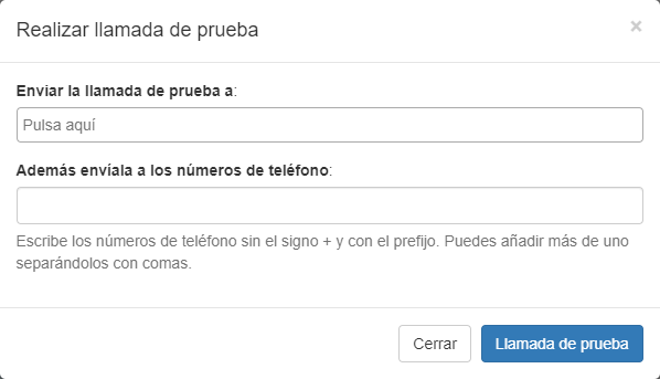Pulsa sobre el botón 'Llamada de prueba' y introduce los teléfonos a los que quieres enviar la prueba. Las llamadas realizadas serán cobradas.