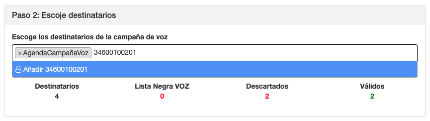 En este paso escogeremos los destinatarios del envío. Los destinatarios de la campaña de VOZ pueden ser: