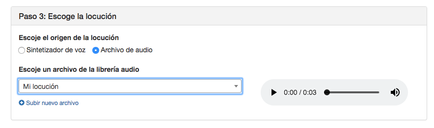 Si escoges archivo de audio como locución, debes escoger un archivo de la Librería de audios, o bien, subir un archivo de audio nuevo que se añadirá a la librería. El archivo debe ser de tipo WAV o MP3 y con un peso máximo de 4MB.