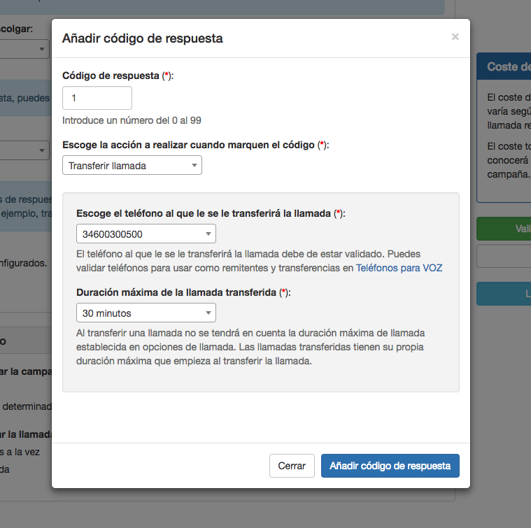 Cuando creas un nuevo código de respuesta debes escoger el código numérico que deberá marcar el destinatario (un código de 0 hasta 99) y la acción a realizar al marcar este código.