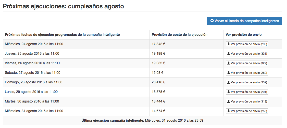 Esta herramienta nos permite comprobar la fecha de las próximas ejecuciones de la campaña inteligente, la previsión de SMS a enviar, el precio estimado para ese envío y los contactos a los que se enviará el SMS.