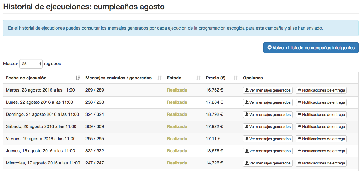 Captura del historial de ejecuciones de una campaña inteligente que felicita a nuestros contactos el día de su cumpleaños