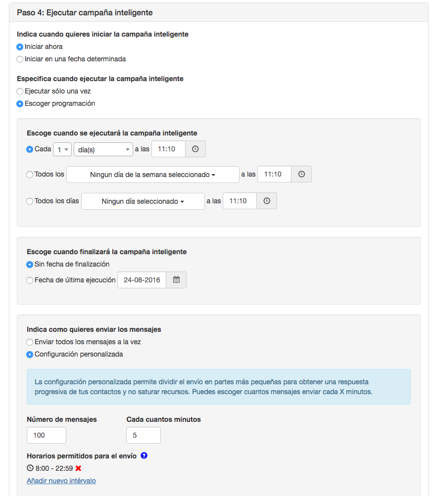 En este paso, elegiremos cuando queremos iniciar la campaña inteligente, cuando se ejecutará y la forma en que quieres que se envíen los SMS.