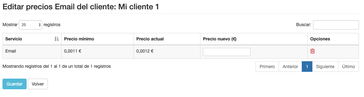 En el caso del servicio de email es mucho más simple ya que no entran en juego los países, así que para cambiar el precio del servicio solo debes editar el campo 'Precio Nuevo'.