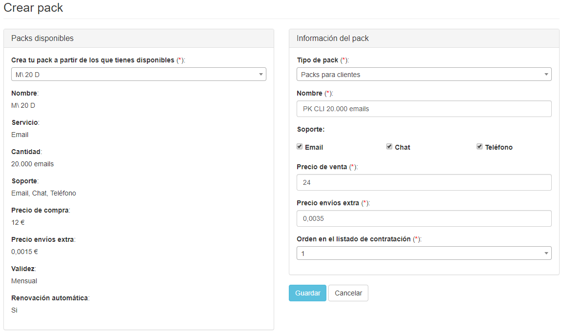 - Orden en el listado de contratación: El valor de este campo se utilizará para ordenar los packs disponibles que ofreces a tus clientes o distribuidores.