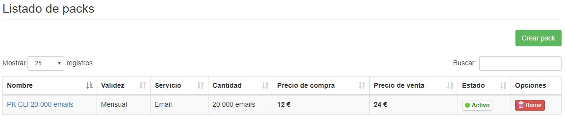 En este listado podrás visualizar todos los packs que hayas creado en tu cuenta, mostrando la siguiente información: