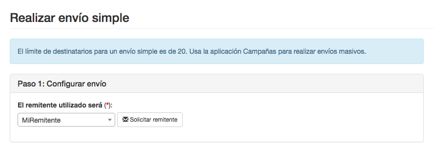 Dependiendo si tienes activada la opción de Validación automática de remitente podrás crear un remitente o solicitar un remitente nuevo si lo necesitas.
