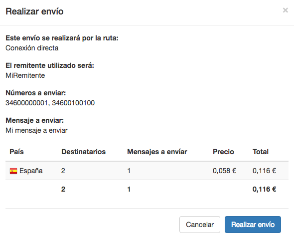 Si el envío se ha validado correctamente, verás un resumen del envío que vas a realizar con todas las opciones que has escogido en los pasos anteriores. También podrás consultar un informe con la cantidad de mensajes que se enviarán por país y su precio.