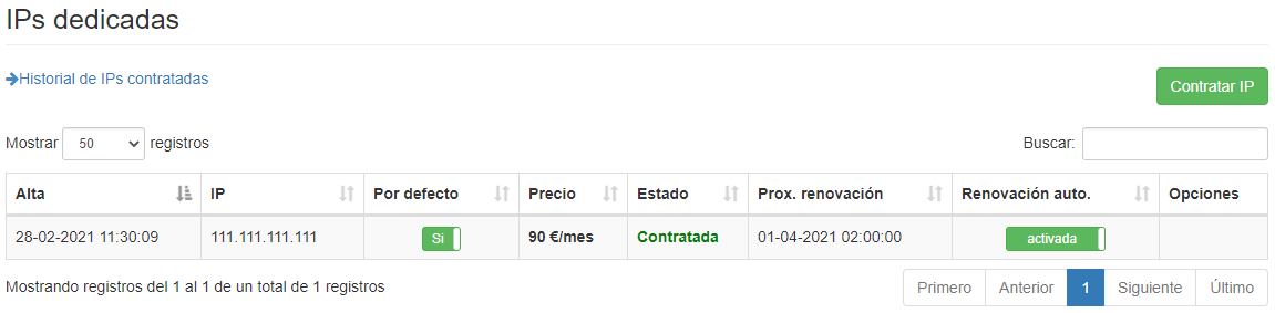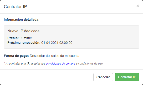 Por lo tanto, después de pulsar el botón 'Contratar IP', si dispones del saldo suficiente según el precio indicado, la IP dedicada quedará contratada en tu cuenta.