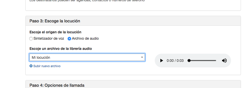 Puedes usar las locuciones de la Librería de Audios en las Campañas de Voz escogiendo 'archivo de audio' en el 'Paso 3: Escoge la locución' al crear o editar tu campaña de VOZ.
