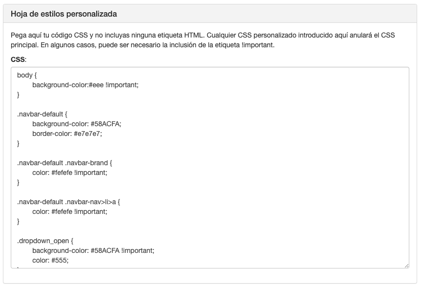 Si deseas modificar el estilo y/o diseño de la plataforma, puedes añadir código CSS para modificar el aspecto general de la plataforma.