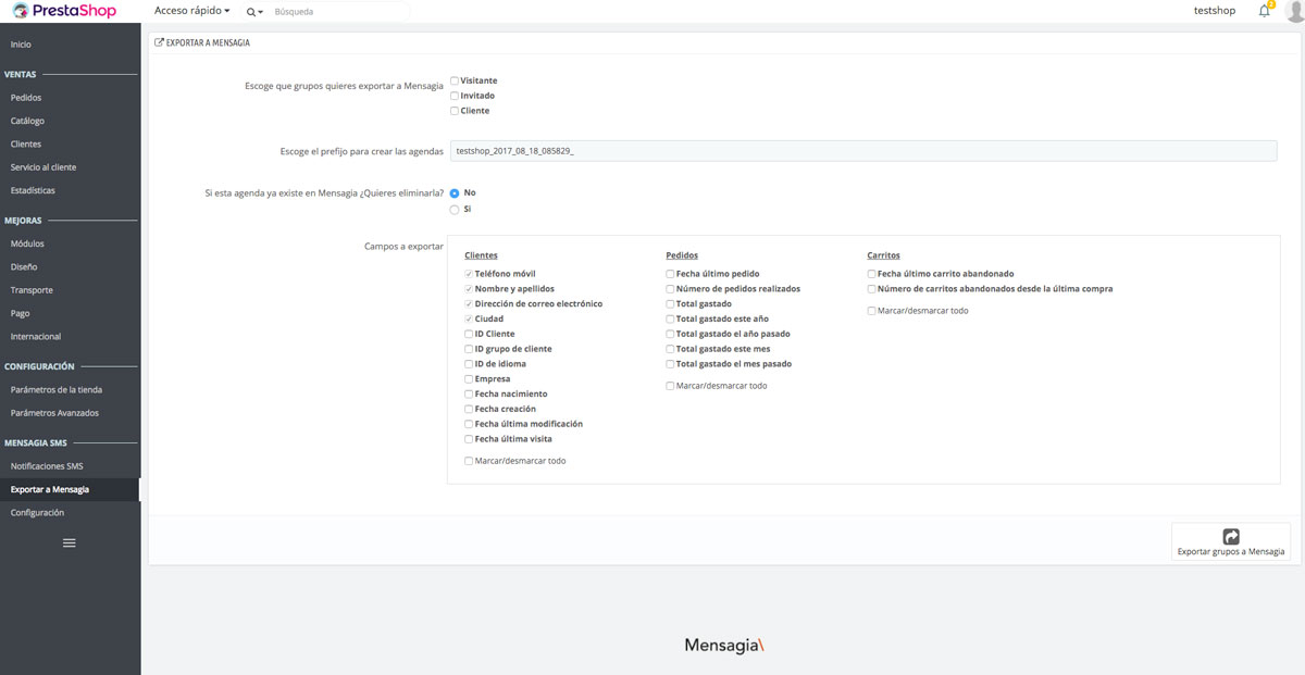 Otra de las funcionalidades del módulo de Mensagia para Prestashop es la de poder exportar los grupos creados en la tienda de prestashop como agendas en Mensagia, exportando también los usuarios que forman parte de estos grupos.