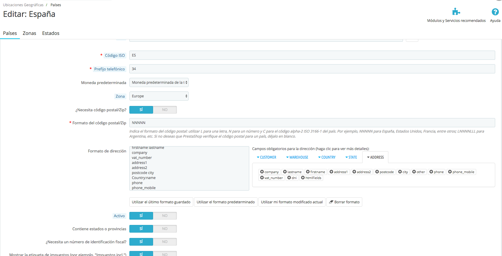 - Se abrirán los campos adicionales para ADDRESS, ahora debes pulsar sobre phone_mobile (o teléfono_móvil) para añadirlo al formato de dirección.