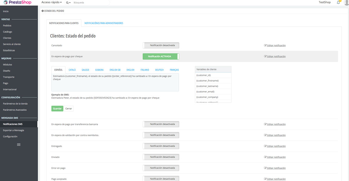 - Envio de notificaciones de Prestashop por SMS