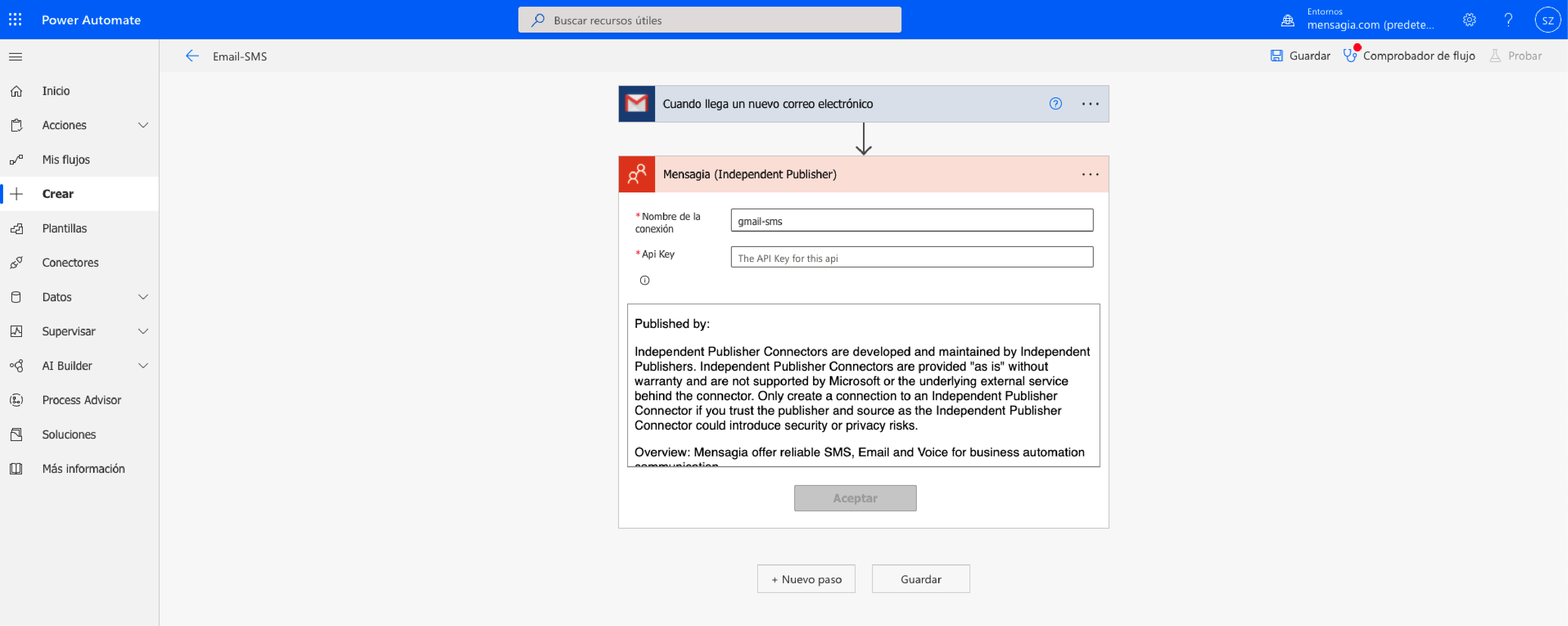 Para utilizar el conector de Mensagia con Power Automate necesitas disponer de una cuenta Premium. Si tu empresa ha comprado Microsoft 365 o Dynamics 365, es posible que ya tengas acceso a Power Automate.