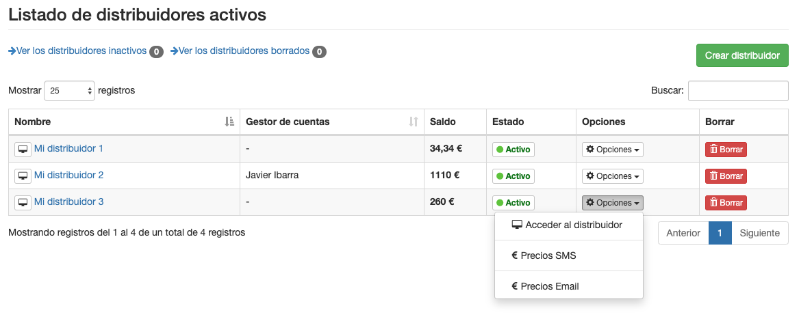Desde este listado, puedes cambiar los precios por defecto de los Envíos SMS pulsando el enlace de Precios SMS para un distribuidor en concreto